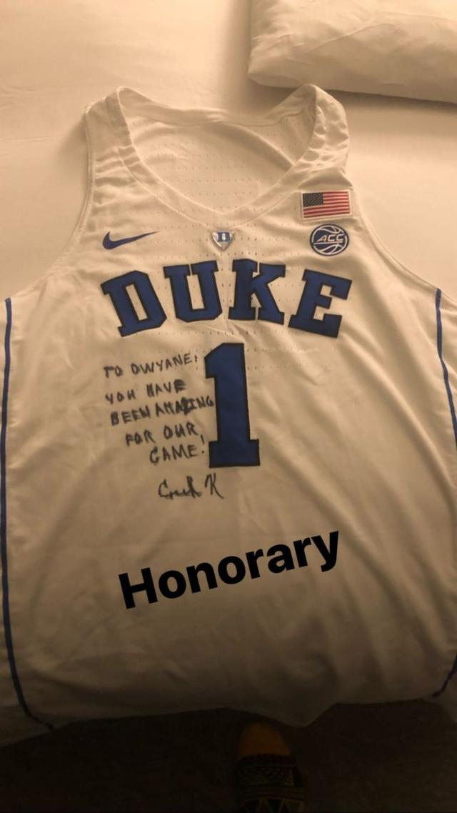 虎扑4月7日讯 热火后卫德维恩-韦德今天在个人Instagram Story上晒出了一张杜克大学主教练迈克-沙舍夫斯基(老K教练)送给他蔡恩-威廉森1号球衣的照片(见新闻配图)。