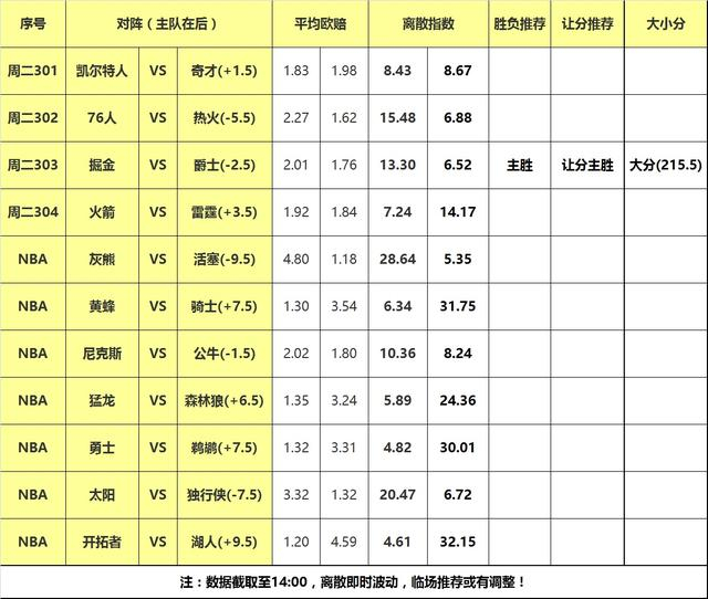 [关于离散] 竞技体育分析指数,也就是各家欧指分歧度。基本原理:百家欧指平均值与每家指数差值的绝对值的求和。离散度小则各家观点接近,进而赛果易打出;离散度大反之意见分歧大,赛果不易打出。又因各方因素影响下指数变动,离散在特殊时刻具有更高参考价值,切勿盲目参考运用。换句话说,离散只是参考指数,而非结论性数据!以下是各场数据汇总(数据截取至14:00):