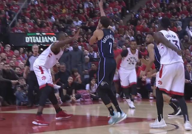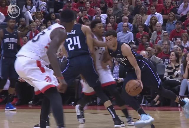 此时,迈卡威持球进攻时,借助队友的掩护甩开洛瑞防守时,被洛瑞的手掌根部拍打到了面门。