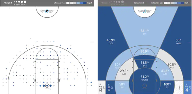 *他能够自己扛起主攻,他有14%的回合是面框单打,有11%的回合是低位背打,但他更主要的还是无球进攻,他有26%的回合是接球跳投,有8%的回合是无球切出,有13%的回合是无球空切。他是真正的有无球兼备且内外兼修的球员。