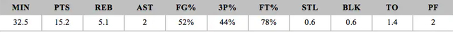 *他更多的是作为空间点,但也在球队中扮演了很多其它角色。他在大一时还主要以突破为主,但在大二学年大幅拓宽了自己的射程。他还是仍然喜欢投中距离,但他每次接球跳投可以得到高达1.28分展现出了他在三分线外的潜力。他出手速度并不快,但很柔和,投篮姿势稳定可靠。他很少干拔跳投,每次干拔跳投只能得到0.77分,因此他运球之后还是更喜欢突破。