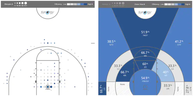 华盛顿在进攻端所扮演的角色通常都是终结点,需要留意的是,他还能极具侵略性地冲抢前场篮板,他的补篮出手占比达到10%,他在补篮时每回合能得到1.255分。而在半场阵地进攻中,华盛顿在攻击篮筐时每回合能得到1.153分。华盛顿在篮底的终结效率很高,但他现阶段更习惯于利用身体对抗把球打进,而非利用技巧。