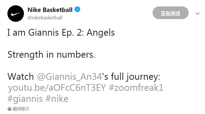 在纪录片最新一集的宣传中,Nike官推在推特上写道:“《我是字母哥》第二集:天使。众志成城(Strength in numbers)!”