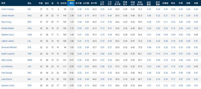 NBA是一项以最终比分大小确定胜负关系的比赛,因此球员的得分能力成为了我们首先需要关注的焦点。在关键时刻得分方面,由于最后时刻的进攻往往交到当家球星的手中,所以榜单前列基本都是联盟中的头号进攻选择。尽管如此,排在第一的维克托-奥拉迪波仍然算是出乎意料的结果,他以每分钟1.51分力压上赛季得分王詹姆斯-哈登(1.34分)登顶,要知道这位步行者后场发动机第四节场均7分钟的时间里也只有5.5分进账。