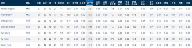 而在本赛季关键时刻出场时间超过100分钟的球员里,投篮命中率排在倒数第一位的又是我们的老朋友——安德鲁-维金斯。在之前的合同性价比分析中,我们的“养生篮球创始人”枫叶曼巴就成功反向登顶,荣膺垃圾合同之首。这一次他以22.7%的投篮命中率和28.6%的真实命中率再度登榜,进攻效率之低实在难以配得上状元之名。