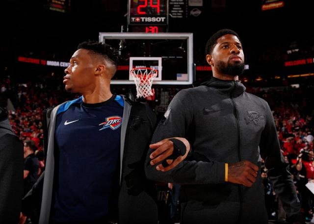 除了前面提及的多诺万-米切尔,上赛季的雷霆双子星也堪称是关键时刻的毒药,二人虽然在分均得分方面双双跻身联盟前30位(乔治甚至高达第11),但得分效率实在不敢恭维。威少投篮命中率低至35%,真实命中率同样仅为49.3%;相比来说乔治虽然投篮命中率也只有37.5%,但是因其出色的外线手感和造犯规能力,他的真实命中率能够达到58.6%这一合格的标准。