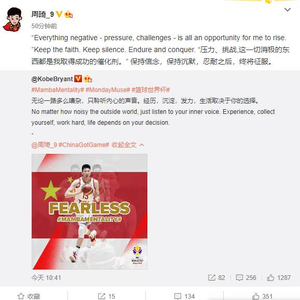 科比发文勉励周琦 周琦回复:保持信念 终将征服