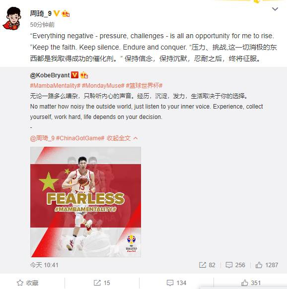 周琦则回复:“压力、挑战,这一切消极的东西都是我取得成功的催化剂。保持信念,保持沉默,忍耐之后,终将征服。”