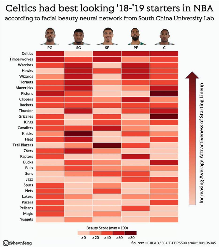 据报道,该排名是根据中国华南理工大学(SCUT)所开发的人脸识别算法,计算2018-19赛季各队首发的脸部特征,将“社交吸引力”的相关特征进行排名,其中颜色越深表示该球队在所在位置的球员越具有“社交吸引力”。