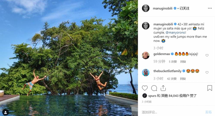 直播吧7月29日讯 今日马刺名宿前NBA球星马努-吉诺比利在其个人社媒上传了一张自己与妻子度假的照片。(见配图)