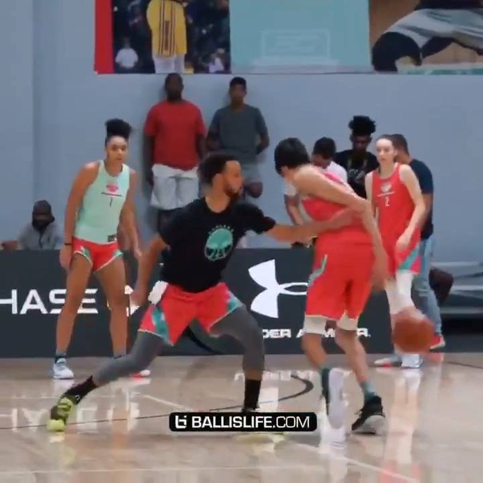比赛中,来自明尼哈哈学院(Minnehaha Academy)的高中生切特-霍姆格伦(Chet Holmgren)面对库里的防守,用出了库里经常使用的动作——双背后运球晃过了库里突入内线,再用出了库里不经常使用的动作——扣篮,终结了此次精彩进攻。
