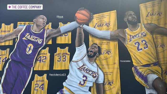 图中詹姆斯穿着黄色球衣,戴维斯则是白色,库兹马紫色,三人手握同一个篮球,背后则是湖人的退役球衣和冠军旗帜。