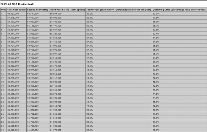 对于30名首轮秀来说,选秀年份和选秀顺位确定了,他们接下来4年的薪水也就基本确定了,劳资协议中对每一年新秀合同的工资都有详细的规定。以下为今年的30名首轮秀今后四年每一年的薪水: