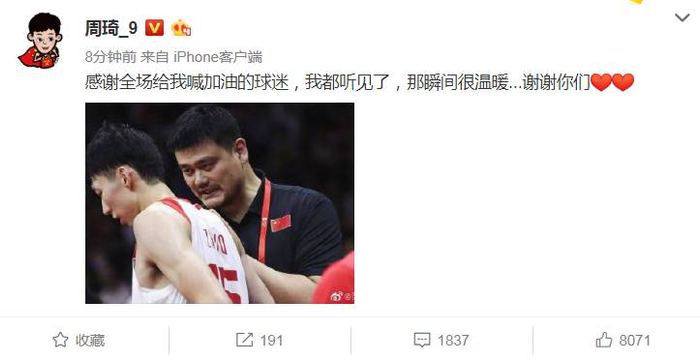 赛后,周琦在自己的微博上写道:“感谢全场给我喊加油的球迷,我都听见了,那瞬间很温暖...谢谢你们