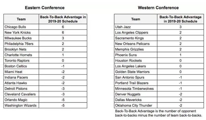 对于每支球队我都计算了他们赛程里涉及到背靠背比赛所带来的优劣势总和。我用各球队赛程中遇到对手处于背靠背的场次减去他们本身背靠背而对手正常的场次,令我感到惊讶的是背靠背场次差距比想象中要大,如下表所示: