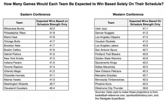 话虽如此,我们仍然可以从表中看到,东部球队的赛程普遍要比西部轻松一些,总的来说差距并不大。东部球队赛程平均胜场为41.4,西部则为40.5,仅仅相差不到一场比赛。