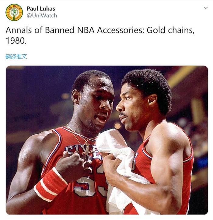 1980年:当年76人中锋达里尔-道金斯习惯在比赛时戴着一串耀眼的大金链子,一时间联盟中很多球员都跟风学习,很快NBA官方便以潜在的安全风险为理由禁止了。(不过后来一些球员,比如乔丹,曾在一些像是扣篮大赛之类娱乐展示性的活动中佩戴过大金链子)