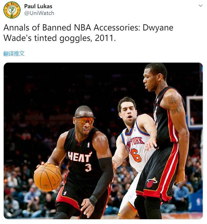 2011年:韦德,对又是这位闪电侠,曾因感光性偏头痛而在对阵尼克斯的一场比赛中戴着深色护目镜。联盟经过认真讨论后决定禁止这种类似墨镜的装备,原因是它会给韦德带来额外比赛优势,这对其他球员来说是不公平的,如果韦德戴上这种护目镜,对手会看不到他的眼睛。