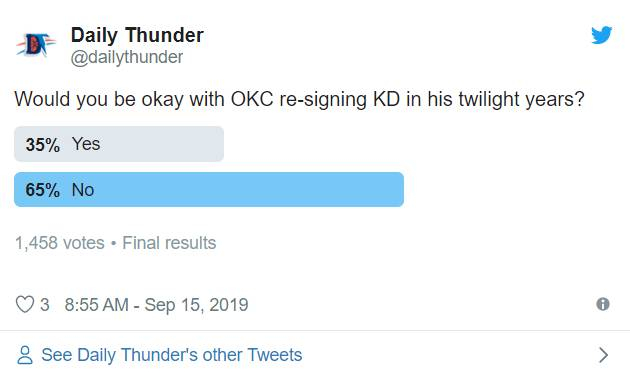 (推特网络投票是否接受雷霆签回生涯末期的杜兰特,1458人投票,35%是65%否)
