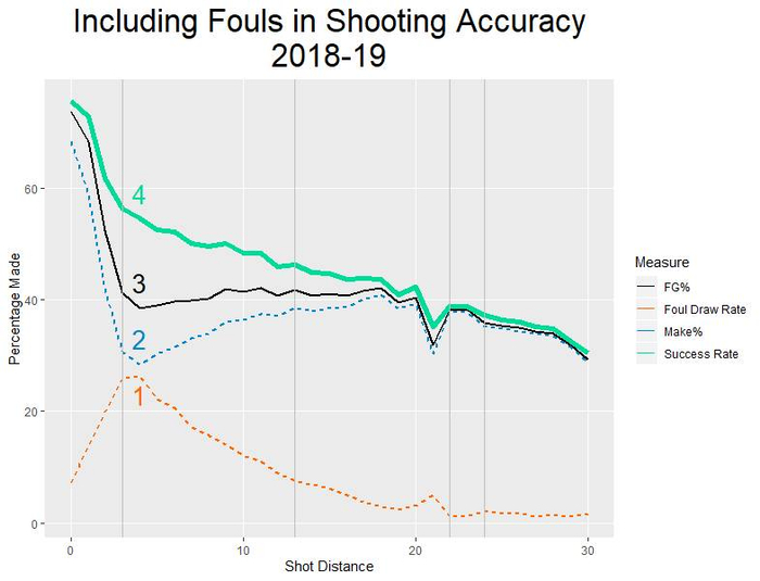 远离开对抗区(篮下)的传统投篮命中率数据相对来说还算精确(图线3)。但是传统的投篮命中率忽视了球队虽然没进但成功制造了犯规的情况,这些都没有被算做是投篮。越靠近篮下的犯规率反而会急速下降,这个反常仔细想想也可以理解,因为如果防守人在篮下可以对你犯规,但他可能更加会尝试防下你(比如盖帽、切球)。一离开对抗区犯规率就会飙升,在超出三分线后犯规率稳定在1.5%左右(图线1)。在被犯规的情况下还能投进球一般来说更加困难,因此出手成功率,也包括被犯规的情况(make%,图线2)的趋势和犯规率(图线1)正好相反。而成功的投篮被定义为成功出手和搏到罚球,所以图线4是图线2和1的相加结果(除去了重复的情况)。虽然这种描述方法仍然不能算是完美,但起码比只用命中率和投篮效率来形容投篮质量要更为客观合理。