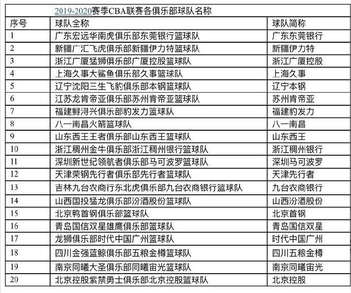 直播吧10月11日讯 CBA联赛公布了新赛季各俱乐部球队名称,其中上赛季冠亚军广东和新疆的简称分别是广东东莞银行和新疆伊力特。