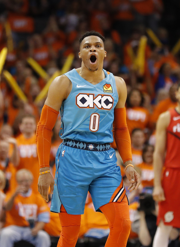 亨特-辛伯格:2018年雷霆队在首轮季后赛的第五场系列赛中,球队一开始就被全面压制着,对手不断地打出攻击波,现场的雷霆队球迷也失去了往日的活力。到了第三节的时候雷霆队还落后对手25分,本以为这场比赛的结果已经注定了,然后威少开始了他的表演,他用一记又一记的三分球将球队从悬崖边挽救了回来,那个人挡杀人佛挡杀佛的威少又回来了。威少用犀利的进攻和积极的防守拯救了球队,那场比赛也是NBA季后赛历史上最伟大的逆转之一,赛后我才意识到威少从没有过放弃比赛的想法。