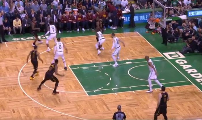 2017-2018东部决赛,在最后的三场比赛中,每当詹姆斯低位换到罗齐尔防守时,弱侧的大白贝恩施会迅速回到篮板附近,到一个詹姆斯传球可以扑出去,强吃罗齐尔能协防的位置待命;当詹姆斯运球开始找队友时,贝恩斯迅速上前包夹詹姆斯,由于罗齐尔和贝恩斯上下齐手封堵了詹姆斯的进攻路线,所以,詹姆斯只能更远离篮筐;与此同时,贝恩施防守的球员暂时由弱侧的凯尔特人来兼顾,负责破坏传球线路,影响詹姆斯传球,同时罗齐尔迅速回到贝恩斯防守位置,完成了破坏骑士大吃小的换防,这也在一定程度上帮助了2017-2018赛季总决赛的勇士,给防守詹姆斯强吃库里支了一招,而且这种防守方式也延续到本赛季的凯尔特人泰斯和沃克身上。