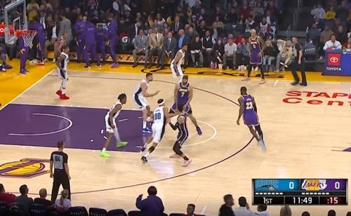 魔术围绕武切维奇的三分射程和高质量掩护展开阵地战进攻,武切维奇的射程迫使麦基必须跟防至三分线,湖人内线空虚,魔术主打高位挡拆传切多点袭筐杀伤,辅以迅猛推攻守转换——首个暂停,魔术16-12湖人,魔术16分之中有13分来自于转换杀伤和禁区攻坚。