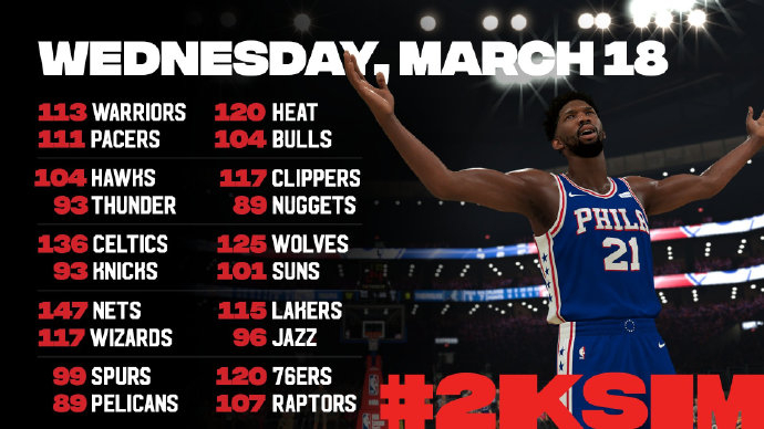 直播吧3月19日讯 NBA赛季暂停之后,游戏《NBA 2K20》就开始用自家游戏模拟每日赛果。