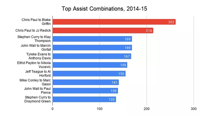 在这份榜单里,一些组合是通过个人扎实的技术,以及对时机的把握、脚步还有两人的化学反应来击溃对面的防守。然而,保罗与格里芬不需要这些特点。要搞清楚一件事,尤其在格里芬成长为一名全面的球员后,他们也都具备这些特点。在2013-14赛季和2014-15赛季,两人双双进入了MVP评选的前十位。