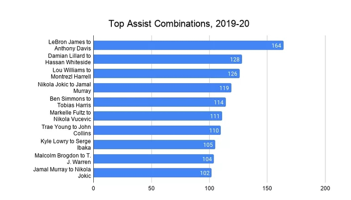 2019-20赛季的助攻双人组第一名是一对新人,但你不会感到意外。勒布朗-詹姆斯在助攻数领先全联盟,这也是他职业生涯首次做到这一点。他的新队友安东尼-戴维斯是他最喜欢的传球目标。詹眉连线成为了本赛季助攻次数最多的组合,并且领先第二名非常多。