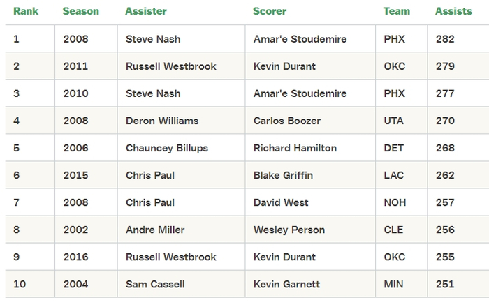 威少和杜兰特比这份前十榜单里的任何组合打的时间都要长,实际上,他们两的助攻总数仅次于帕克和邓肯。他们的联手开始于2008-09赛季,威少的新秀赛季,他们两人的合作也激励了后来很多进入联盟里的年轻球员。