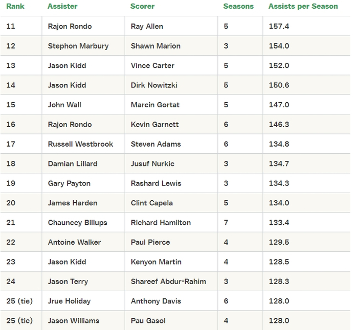 要记住,这个榜单并没有考虑到赛季里缺席的比赛,所以,考虑马里昂在第四个赛季只打了48场比赛,但我们并没有除以3.6,而是除以4。理论上来说,这对组合平均每赛季的助攻数可以达到229.5次,也就会排在这份榜单的第二位,直逼第一名的数字。