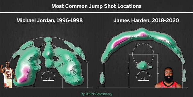 近20年,联盟中的超级得分手的主要得分方式发生了很大变化。下图是乔丹和詹姆斯-哈登得分区域的对比: