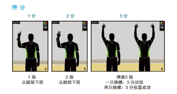 当球员执行一次罚球命中之后,裁判通常会右臂上举,握拳的同时伸出食指,做手腕下压的动作;当球员在三分线内完成一次运动战得分后,裁判通常会右臂上举,握拳的同时伸出食指和中指,做手腕下压的动作;当球员在三分线外投篮时,裁判会右臂上举,伸出拇指、食指和中指来表示场上有球员进行了三分试投,当球命中之后,裁判需要两只手臂同时上举,伸出拇指、食指和中指来表示三分投篮命中。
