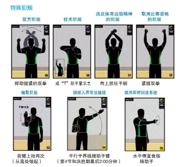 这里只介绍一下技术犯规、违体犯规和骗取犯规的裁判手势:当