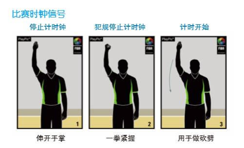 比赛净时间的控制是裁判的一项重要任务,当裁判伸开手掌右臂上举时,则表示停止计时;当裁判将上举的右臂快速向下做下劈动作时,则表示计时开始。