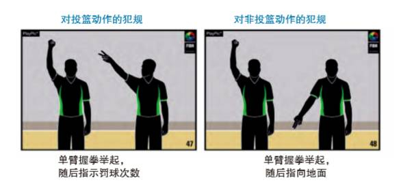 在篮球规则中,会有单场比赛中的单节犯规次数和单场比赛中的个人犯规次数的限制,当单节犯规次数未到4次时,产生的非投篮犯规不执行罚球,当出现对投篮动作的犯规或单节犯规次数已达上限时,产生的犯规就会执行罚球。对非投篮动作的犯规,裁判通常会举起握拳的右臂,随后指向地面;对投篮动作的犯规,裁判通常会举起握拳的右臂,随后伸出与罚球次数对应的指头数量。