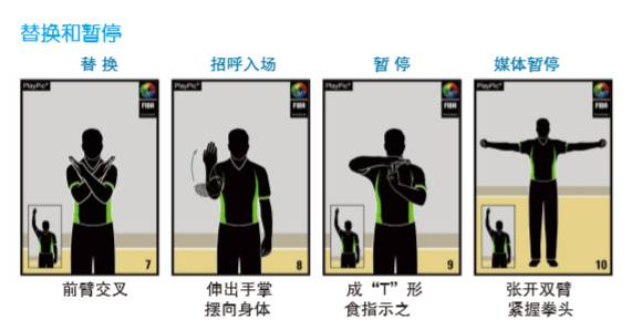 当场上出现死球、掌握球权的一方要求换人时,裁判需要将两只前臂交叉放在胸前,示意换人;当掌握球权的一方要求暂停时,裁判需要将右臂抬起,掌心向下水平放置,左手伸出食指与右臂配合做出“T”(英文Timeout的缩写)形来示意暂停。