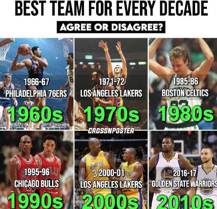 直播吧4月25日讯 有美媒评选出了NBA各个年代(每十年)最佳一支球队,你认同么?