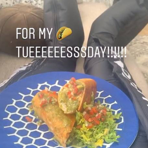 他今天按时打卡上线,晒出一张Taco的照片,并配文:“我的墨西哥卷饼星期二(Taco Tuesday)!!!!”