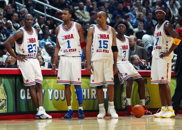 彼时全明星票选方式还没有改制,所有的首发球员都是由球迷们投票选出。在东部后场球员里,乔丹的票数不敌当时正如日中天的艾弗森和麦迪,遗憾落选了。