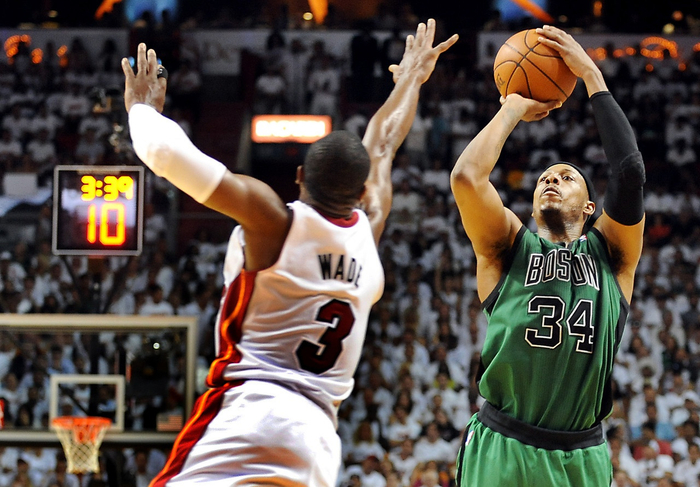 皮尔斯和詹姆斯之间在季后赛交手过很多次,不少人把皮尔斯视作詹姆斯的“一生之敌”在这里我们姑且不谈这个说法是否合理,我们只说他们之间的第一次交手——2008年的东部半决赛。那时的詹姆斯刚刚步入巅峰,风华正茂。他已经带队进过一次总决赛了,这次又带领着那支骑士队一路杀到了东部决赛,并把那支冠军凯尔特人逼到了抢七。到底谁才是最好的小前锋?这其实是一个掷铜板的问题。这可能是二十年来北岸花园球馆里最激烈的一场比赛了。为了让这个场景更加戏剧化,比赛前的烟火在球场上留下了一层浓雾,让比赛看起来像是在银翼杀手的世界里进行的。皮尔斯和詹姆斯没有让大家失望,他们各自都拿出了自己的最佳状态,在球场的各个角落相互撕扯。