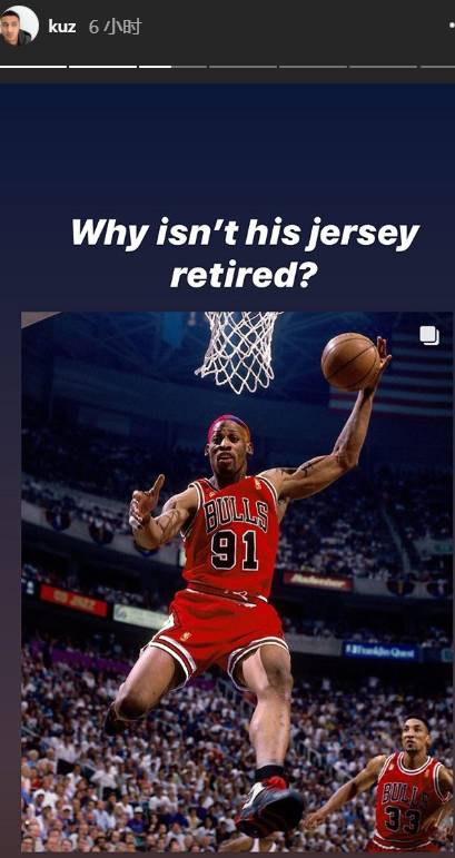 直播吧5月19日讯 今日湖人球员库兹马在其社媒发出了一张罗德曼经典赛场照并发问:“为什么公牛不退役他的球衣?”