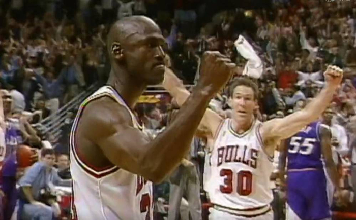 投进绝杀球的乔丹握拳庆祝,十分霸气。