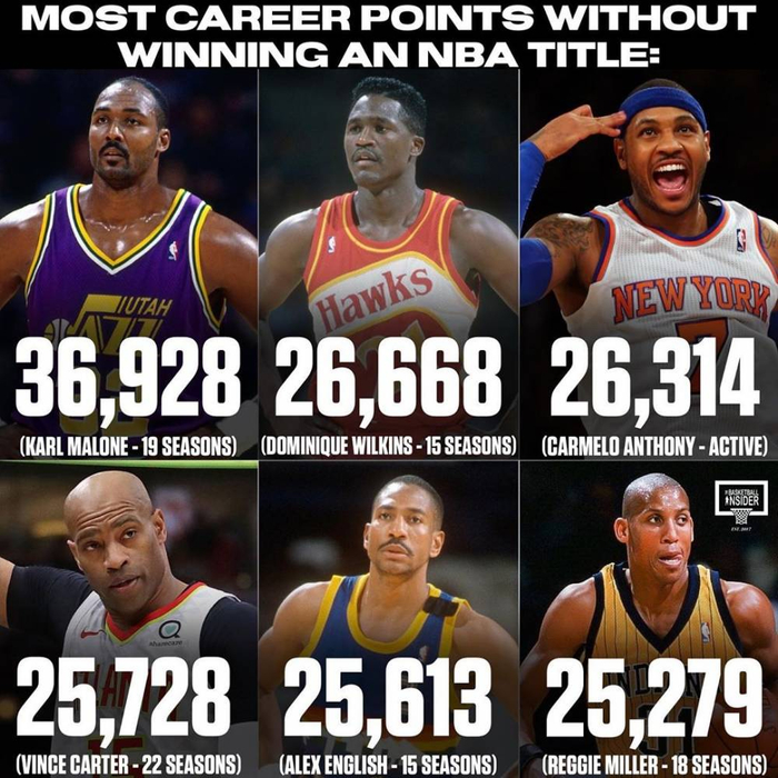 NBA历史上有不少球星在联盟里征战至少15个赛季以上却未能夺冠,例如卡尔-马龙在NBA打了19个赛季,总分高居NBA常规赛得分榜第2,却在90年代两次总决赛折戟负于公牛遗憾未能夺冠。