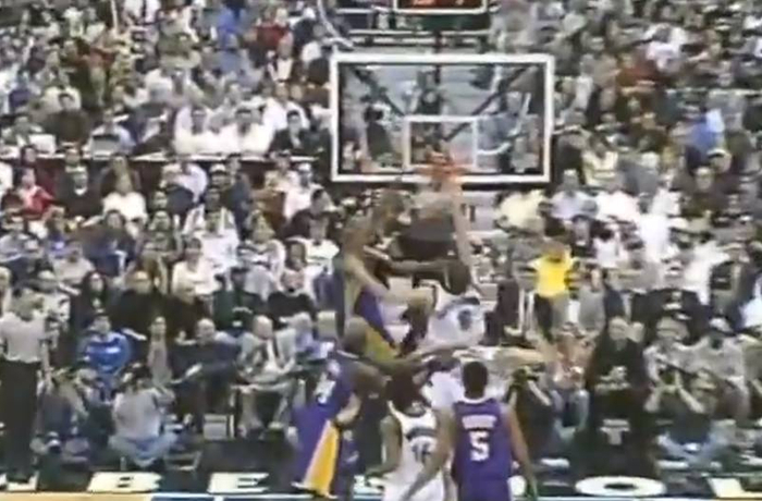 2003年4月30日,西部季后赛首轮G5,湖人做客对阵森林狼。比赛进行到第三节7分多钟时,湖人的进攻机会,场上队员一顿传导后,皮球来到右侧的科比手里,飞侠持球过掉加内特杀向底线,面对内斯特洛维奇和KG夹防强上,完成精彩绝伦的拉杆暴力反扣,落地后顺势缓冲了一波。