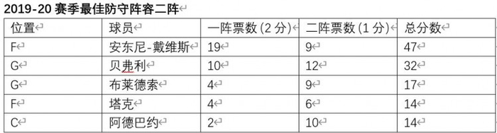 教练们投票选出了他们心目中的最佳防守一阵和最佳防守二阵。一位教练说道,“当你在面对这些球员时,你要改变你的战术和打法。尤其是一阵里的那些球员,他们有能力改变比赛。每次遇到他们,你都要做好侦查和准备工作,思考对方的对位,思考如何不让他们通过防守改变比赛。”
