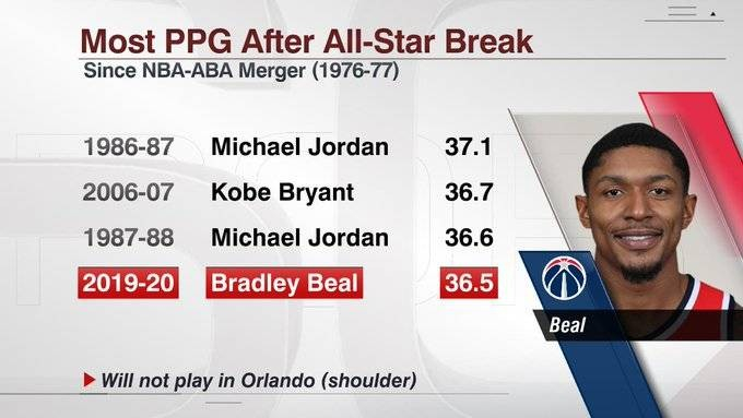 比尔在全明星周末过后场均砍下36.5分,为NBA和ABA(1976-77赛季)合并以来第四高分,仅次于乔丹(1986-87赛季 37.1分&1987-88赛季 36.6分)和科比(2006-07赛季 36.7分)。
