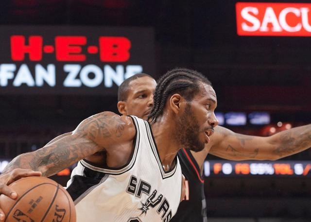 比赛开始后马刺队第一次进攻,伦纳德在三分线外面对阿里扎果断抬手命中三分,为马刺队得到了第一分。那个赛季伦纳德的三分命中率高达38%,但火箭由于忌惮伦纳德的急停中距离能力,阿里扎还是选择了堵在三分线后一步的位置来防守伦纳德。一分钟后,伦纳德底线接球后撤步命中跳投,随后一回合他在反击中再中三分。开场不到三分钟,伦纳德已经得到了8分。看来马刺队本场最大的调整,就是让伦纳德更果断的进攻。